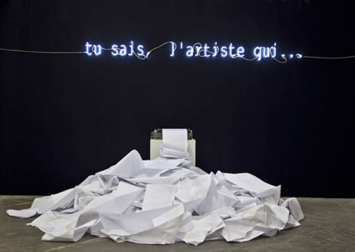 120 x 8" neon sign and installation with dot matrix printer running continuously, paper, laptop and pedestal. Edition of 3