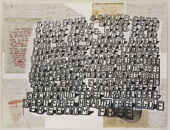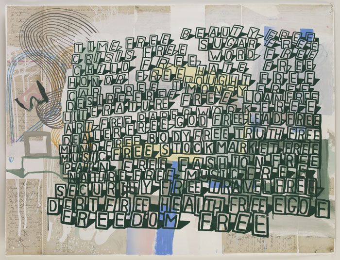 I AM LIVING IN THE WORLD and FREE are both screenprints with hand painting and/or collage on Stonehenge paper, measuring 50 x 38 and 38 x 50 inches respectively. The former consists of 20 unique states and the latter consists of 18 unique states, signed and dated on front, numbered on verso.