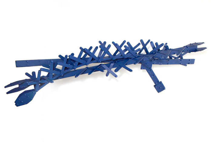 Constructed to resemble metal beams and rivets in various states of torque, Debris poetically employs the illusion of space, weight and materials. This project, Debris, illustrates elemental themes that appear repeatedly in Mia Feuer's work, investigating the tension between destruction and rebuilding; despair and hope; descent and elevation.